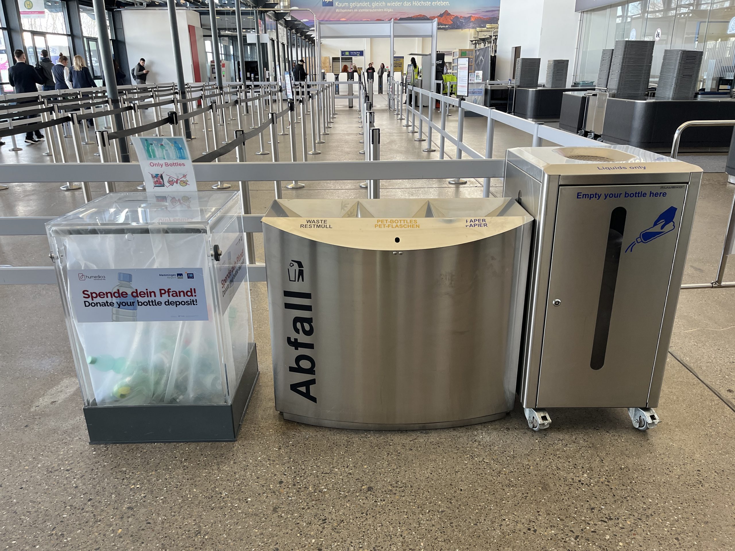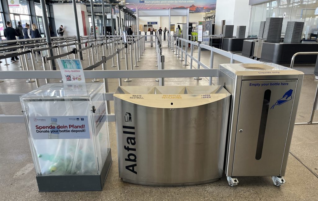 Am Flughafen Memmingen stehen vor der Sicherheitskontrolle Flüssigkeitssammelbehälter bereit, in denen Getränke vor dem Passieren der Kontrolle ausgeleert werden können.